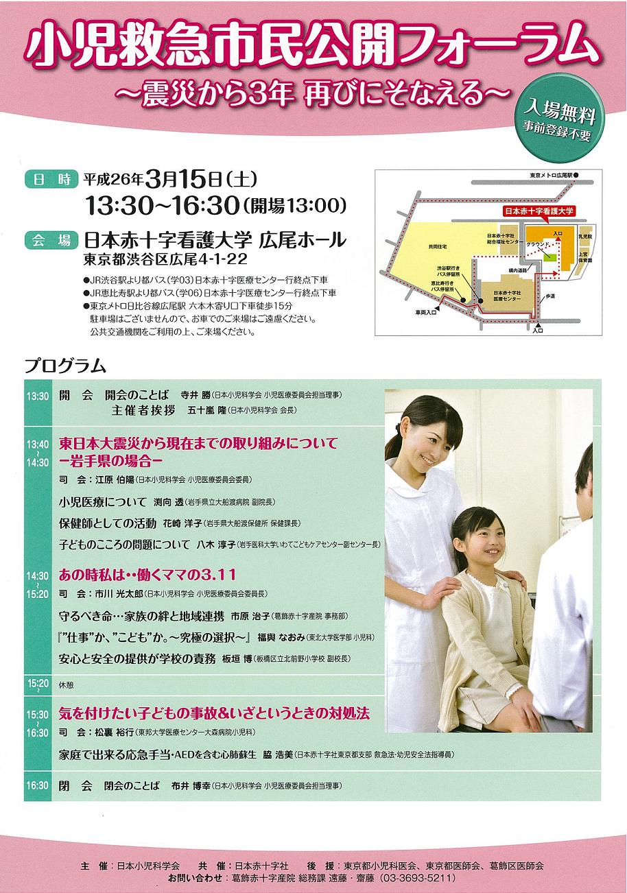 平成26年3月15日(土曜日)13時30分~16時30分、日本赤十字看護大学 広尾ホールにおいて、「小児救急市民公開フォーラム~震災から3年 再びにそなえる~」を開催します。多くの方々のご参加、お待ちしております。(参加費無料・事前登録不要)