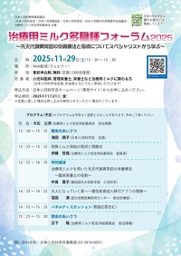 本フォーラムは、医療現場での特殊ミルクとの関わり方や多職種によるチーム医療の実態、ご家族と本人への教育方法について、それぞれの視点から学んでいただける内容となっております。今回は先天代謝異常症の栄養療法と指導についてお伝えいたします。多くの方のご参加をお待ちしております。